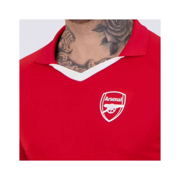 Essa camisa retrô resgata exatamente essa essência: o vermelho vibrante, as mangas com acabamento branco e a gola aberta em estilo clássico — um visual que remete aos grandes times que marcaram gerações em Highbury.
